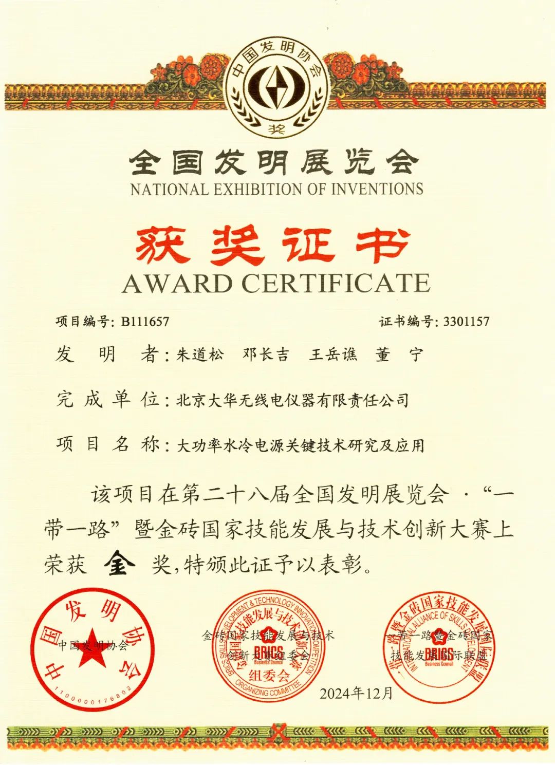 近日,為期3天的第二十八屆全國發(fā)明展覽會·“一帶一路”暨金磚國家技能發(fā)展與技術(shù)創(chuàng)新大賽在中山市小欖鎮(zhèn)落下帷幕,展示眾多前沿科技和發(fā)明成果并評選獎勵優(yōu)秀成果。大華公司“大功率水冷電源關(guān)鍵技術(shù)研究及應用”項目脫穎而出,榮獲金獎!